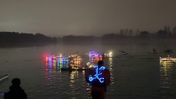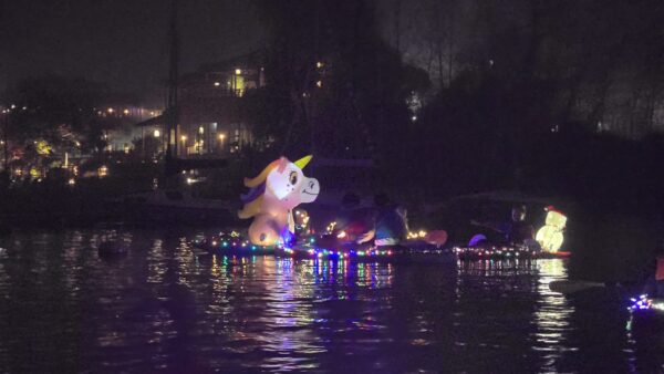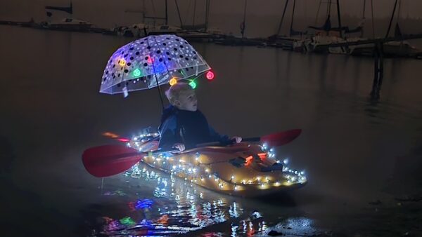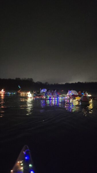 Alles wurde vorsichtig ans Ufer getragen und die besondere Fahrt auf unserem schönen Elbsee, der sich bereits in Nebel hüllte, begann. Die Paddlerinnen und Paddler lenkten ihre liebevoll geschmückten Boote in unterschiedlichen Formationen („nach Lust und Laune“) über den See; alles funkelte wie ein buntes Lichtermeer. Highlight war der Besuch eines großes leuchtenden Einhorns aus dem Einhornland, welches sich in diesem Jahr erstmalig mit uns auf den See traute und mit eingeschränkter Sicht, viel Freude und guter Laune den Zauber des nächtlichen Kanufahrens nochmals verbesserte!