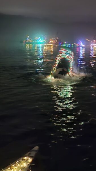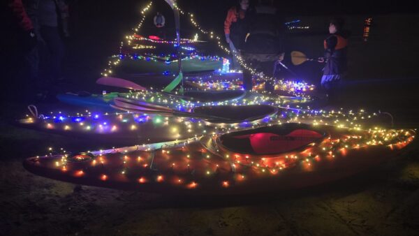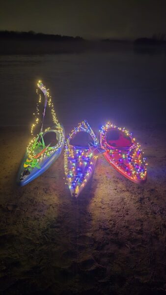 Nach Sonnenuntergang ging es mit großem Eifer und an das Schmücken der Boote. Mit bunten Lichterketten, beleuchtete Tannenbäumchen, ein Pinguin, verschiedene Weihnachtsmänner, kleine Schirme mit Kugeln dekoriert, ein Paddel als Mast und noch vieles andere wurden die Kanus geschmückt.